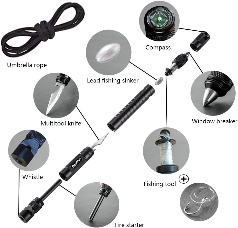 This survival tool (weighing only 88g) integrates 9 critical emergency functions into a single 304 stainless steel device. From window breaking to fire starting, navigation to distress signaling.